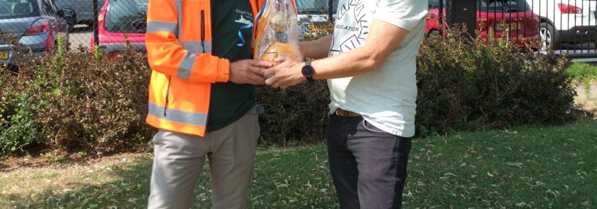 Op de foto zie je Peter Hannen (r) van Westrom die de partnertotem overhandigt aan directeur Marc Paulissen (l).